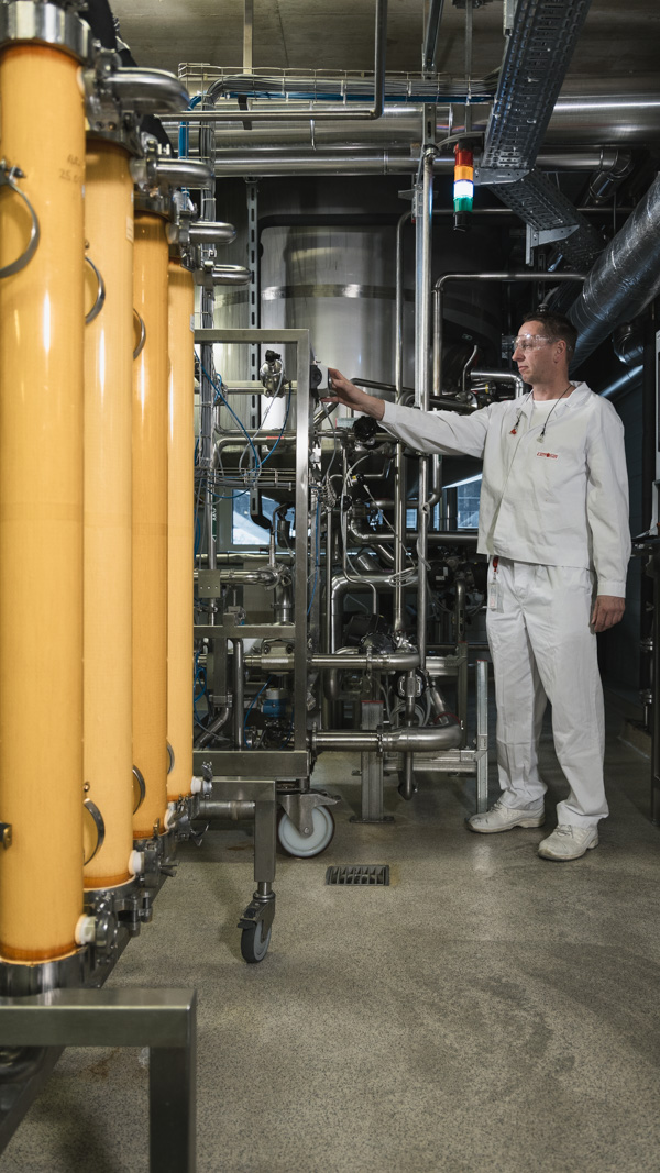 Die bei Lactosan verwendete Uniflux 400 (GE-Healthcare) Anlage ist eine automatisierte Tangential- oder Crossflow-Filtrationsanlage zur Mikro-/Ultra- oder Diafiltration. Ein eigens für die Filtrationsanlage konzipierter 5 000l Erntetank garantiert den reibungsfreien Ablauf der Produktkonzentrierung oder des Pufferaustausches im Enzym-Herstellungsverfahren. Die Feed-Flow-Rate der Anlage beträgt 400l/min bei einer Filterfläche von 112 m2.