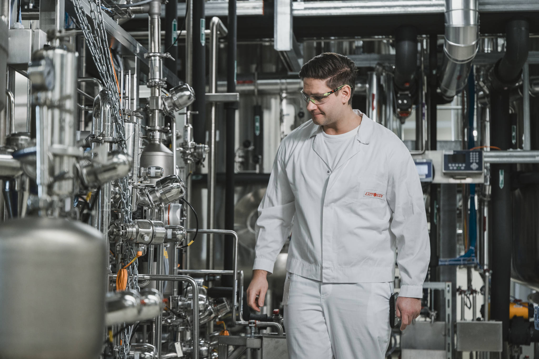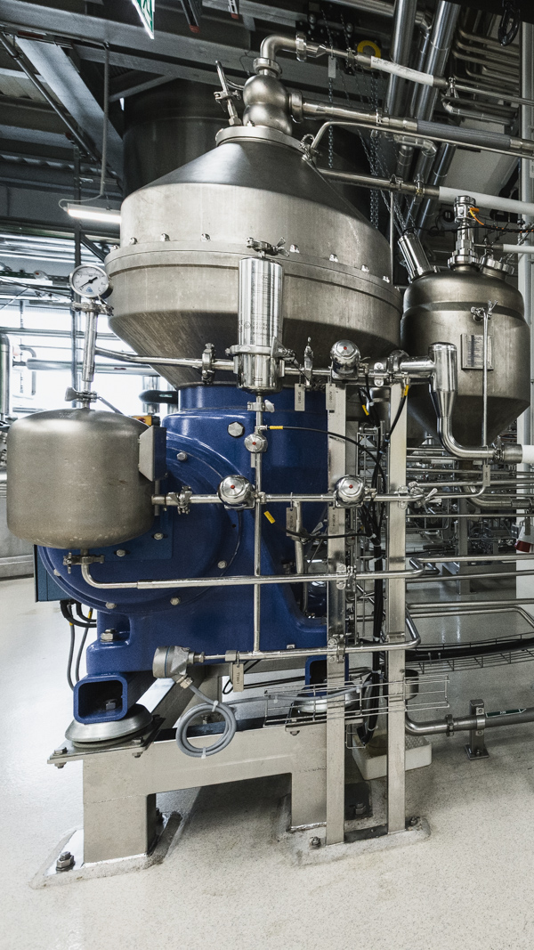 Die Separation der Biomasse vom Überstand erfolgt unter Verwendung einer sterilisierbare Zentrifuge mit einer Leistung von 10 000l/h. Der Durchfluss kann zwischen 100 - 6 000l/h eingestellt und damit an die Erfordernisse des jeweiligen Produktes angepasst werden.