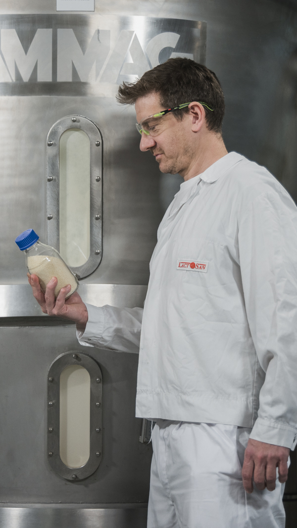 Im ersten Schritt des Wirbelschichtprozesses werden im Prozessbehälter sogenannte Pellets vorgelegt. Durch Anlegen eines konstanten Prozessluftstrom wird dann eine starke Durchmischung (Wirbelschicht) der Kügelchen im Prozessbehälter erzeugt. Das über Sprühlanzen in den Behälter zugeführte flüssige Bakterienkonzentrat wird zu sehr feinen Tröpfchen zerstäubt und kontinuierlich auf die Pellets aufgetragen. Gleichzeitig erfolgt die Trocknung unter milden Bedingungen (34-38°C). Anschließend wird die konservierende Schutzschicht auf die gleiche Art und Weise aufgebracht. . Die Abfüllung des fertigen Endproduktes erfolgt im Reinraum entweder in Säcken (max. 25 kg) oder in Big Bags (500 kg).